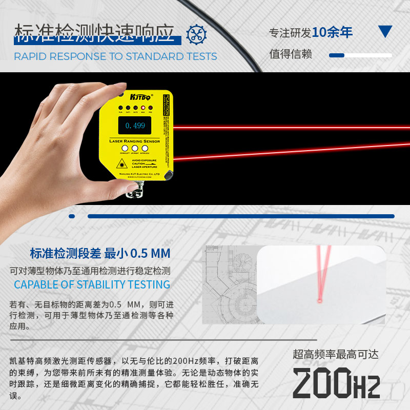 凱基特激光測距傳感器可測垂直或傾斜的目標,不受顏色、材料或光澤度影響。越限繼電器輸出,支持NPN/PNP,電壓模擬輸出;優異的范圍、重復精度和準確度組合可實現高度可靠的目標檢測和精確的距離測量;五個8段顯示屏和按鈕編程,易于安裝、故障排除和實時距離測量。